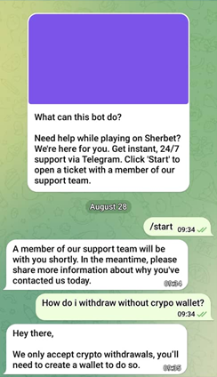 Compared to other Telegram live support chats, Sherbet’s chat is extremely quick and instant. Moreover, the platform supports several languages, including English, German, Spanish, French, Japanese, Portuguese, and Norwegian.