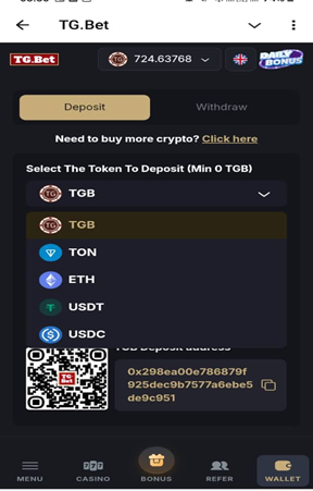 Tg Bet offers a variety of payment options, although limited to just cryptocurrency, to cater to its users. For deposits or withdrawals, you can choose between the native TGB token or other currencies such as TON, ETH, USDT, USDC, BNB, TRX, SOL, and BTC.